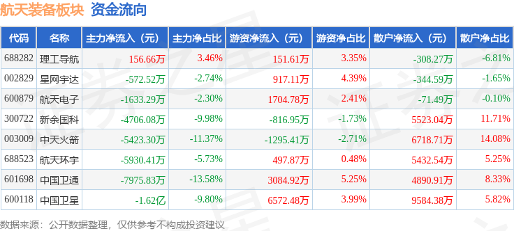 从资金流向上来看,当日航天装备板块主力资金净流出4.22亿元,游资资金净流入1.08亿元,散户资金净流入3.14亿元。航天装备板块个股资金流向见下表: