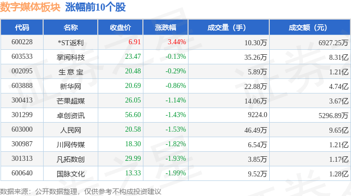 从资金流向上来看,当日数字媒体板块主力资金净流出8.24亿元,游资资金净流出5613.39万元,散户资金净流入8.8亿元。数字媒体板块个股资金流向见下表: