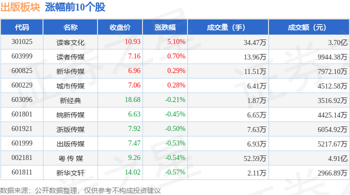 证券之星消息,11月26日出版板块较上一交易日下跌1.22%,荣信文化领跌。当日上证指数报收于3864.18,下跌0.15%。深证成指报收于12907.83,上涨1.02%。出版板块个股涨跌见下表: