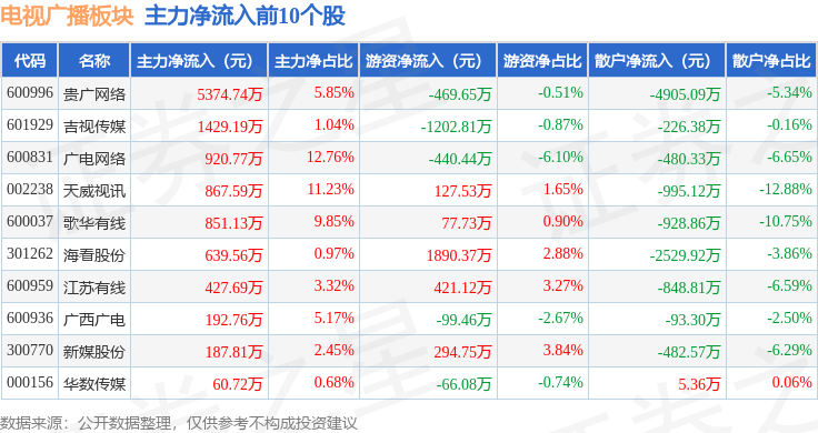 从资金流向上来看,当日电视广播板块主力资金净流入1111.08万元,游资资金净流入7221.58万元,散户资金净流出8332.66万元。电视广播板块个股资金流向见下表: