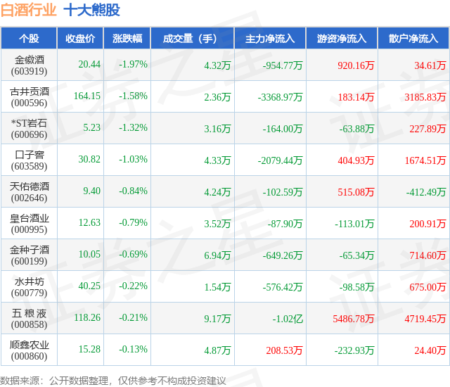 个股表现方面,白酒行业当日领跌股为金徽酒(603919),该股当日报收20.44,下跌1.97%,成交量4.32万,主力资金净流出954.77万元。古井贡酒(000596)以下跌1.58%紧随其后,该股当日成交量2.36万,主力资金净流出3368.97万元。除此之外,*ST岩石(600696)、口子窖(603589)、天佑德酒(002646)均进入当日熊股之列。具体个股列表见下表: