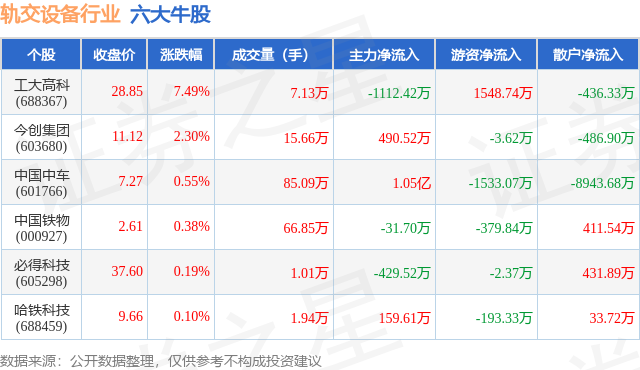 个股表现方面,轨交设备行业当日领涨股为工大高科(688367),该股当日报收28.85,上涨7.49%,成交量7.13万,主力资金净流出1112.42万元。今创集团(603680)以上涨2.3%紧随其后,该股当日成交量15.66万,主力资金净流入490.52万元。除此之外,中国中车(601766)、中国铁物(000927)、必得科技(605298)均进入当日牛股之列。具体个股列表见下表: