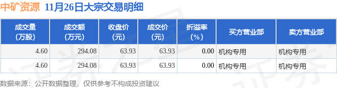 证券之星消息,11月26日中矿资源发生大宗交易,交易数据如下:
