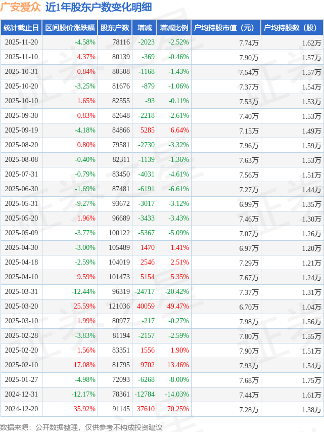 从股价来看,2025年11月10日至2025年11月20日,广安爱众区间跌幅为4.58%,在此期间股东户数减少2023.0户,减幅为2.52%。