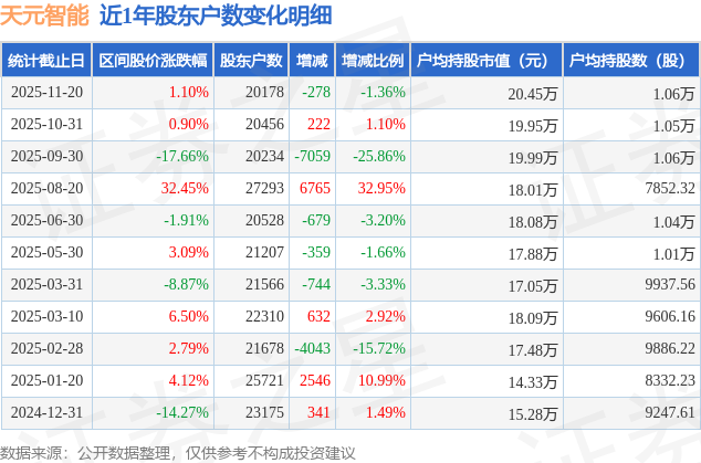 从股价来看,2025年10月31日至2025年11月20日,天元智能区间涨幅为1.1%,在此期间股东户数减少278.0户,减幅为1.36%。