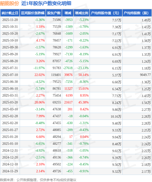 从股价来看,2025年10月31日至2025年11月20日,韶能股份区间跌幅为1.36%,在此期间股东户数减少3953.0户,减幅为5.23%。
