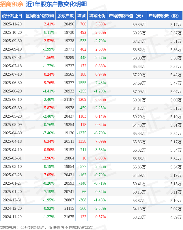 从股价来看,2025年10月20日至2025年11月20日,招商积余区间涨幅为2.41%,在此期间股东户数增加766.0户,增幅为3.88%。