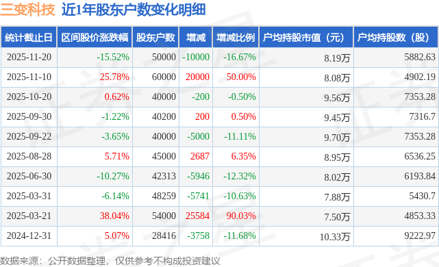 从股价来看,2025年11月10日至2025年11月20日,三变科技区间跌幅为15.52%,在此期间股东户数减少1.0万户,减幅为16.67%。