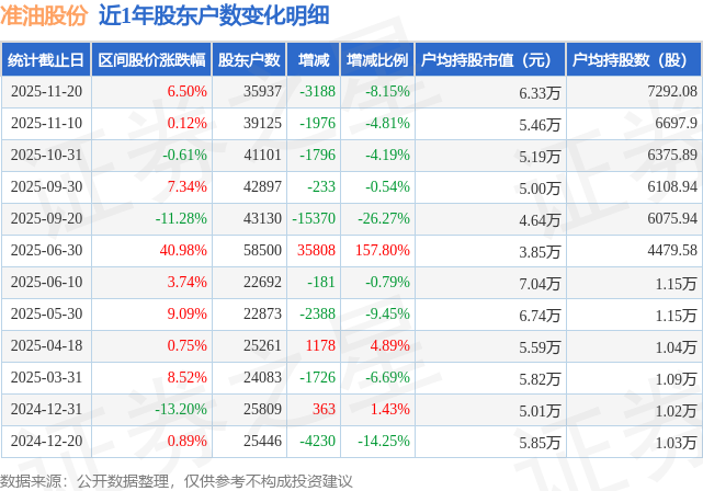 从股价来看,2025年11月10日至2025年11月20日,准油股份区间涨幅为6.5%,在此期间股东户数减少3188.0户,减幅为8.15%。