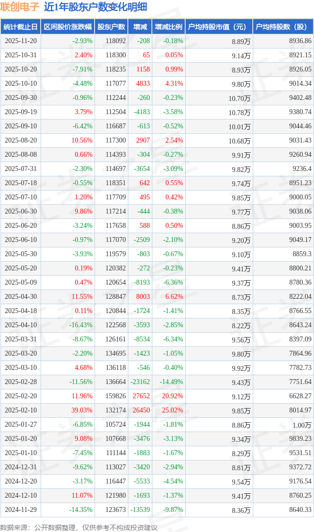 从股价来看,2025年10月31日至2025年11月20日,联创电子区间跌幅为2.93%,在此期间股东户数减少208.0户,减幅为0.18%。