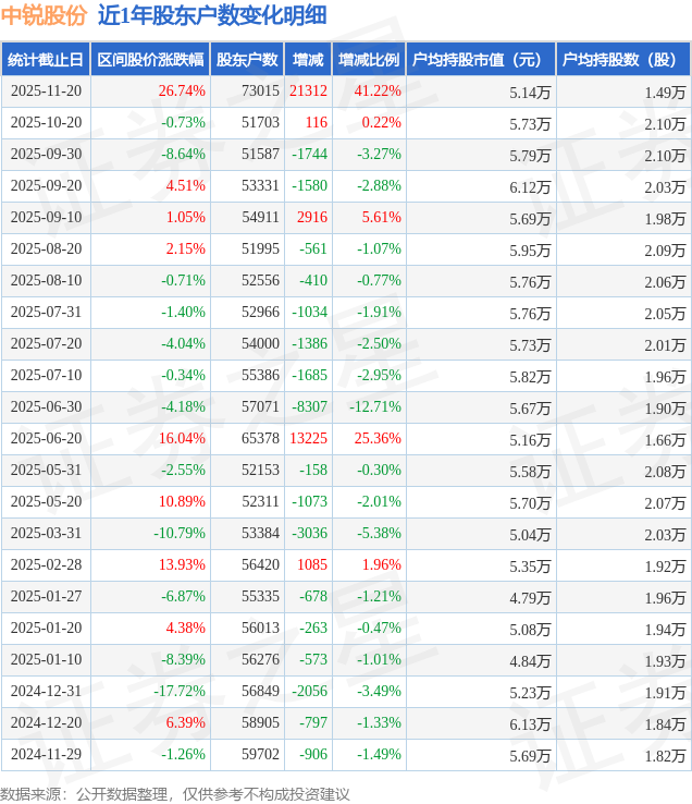 从股价来看,2025年10月20日至2025年11月20日,中锐股份区间涨幅为26.74%,在此期间股东户数增加2.13万户,增幅为41.22%。