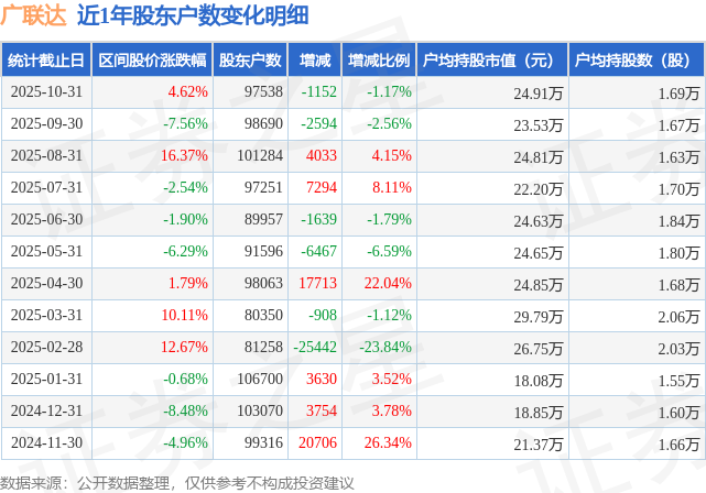 证券之星消息,近日广联达披露,截至2025年10月31日公司股东户数为9.75万户,较9月30日减少1152.0户,减幅为1.17%。户均持股数量由上期的1.67万股增加至1.69万股,户均持股市值为24.91万元。