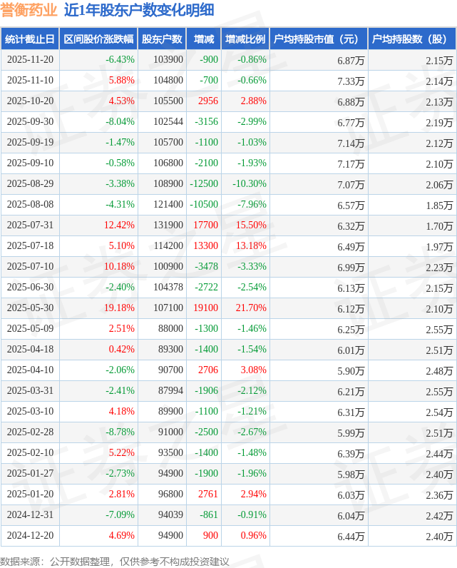 从股价来看,2025年11月10日至2025年11月20日,誉衡药业区间跌幅为6.43%,在此期间股东户数减少900.0户,减幅为0.86%。