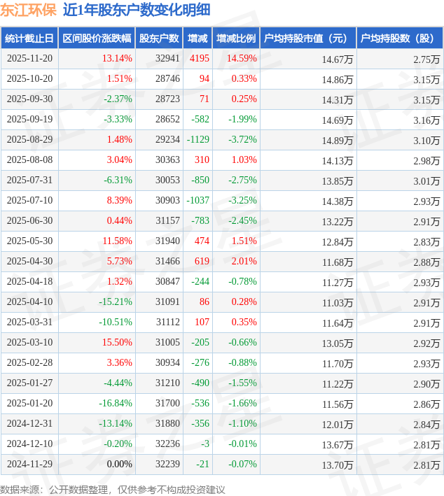 从股价来看,2025年10月20日至2025年11月20日,东江环保区间涨幅为13.14%,在此期间股东户数增加4195.0户,增幅为14.59%。