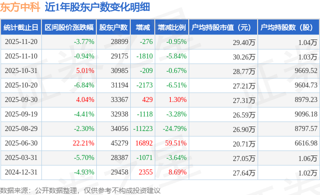 从股价来看,2025年11月10日至2025年11月20日,东方中科区间跌幅为3.77%,在此期间股东户数减少276.0户,减幅为0.95%。