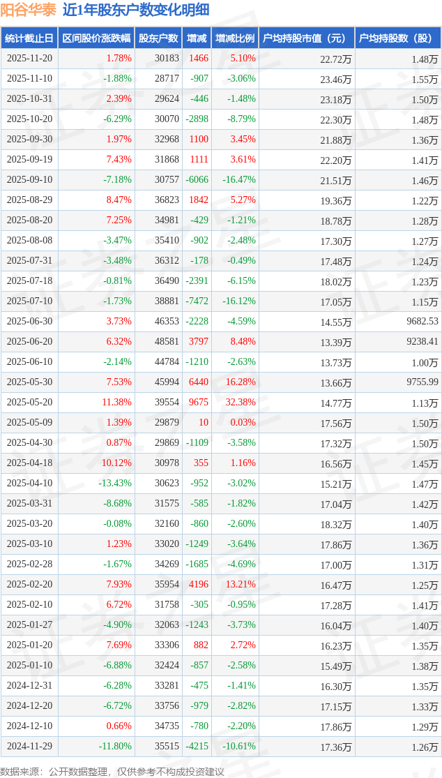 从股价来看,2025年11月10日至2025年11月20日,阳谷华泰区间涨幅为1.78%,在此期间股东户数增加1466.0户,增幅为5.1%。