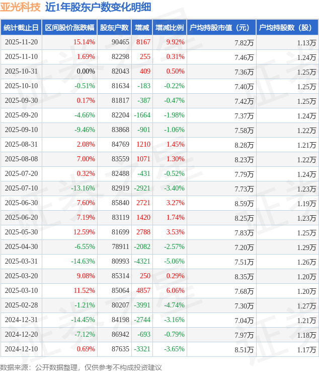 从股价来看,2025年11月10日至2025年11月20日,亚光科技区间涨幅为15.14%,在此期间股东户数增加8167.0户,增幅为9.92%。