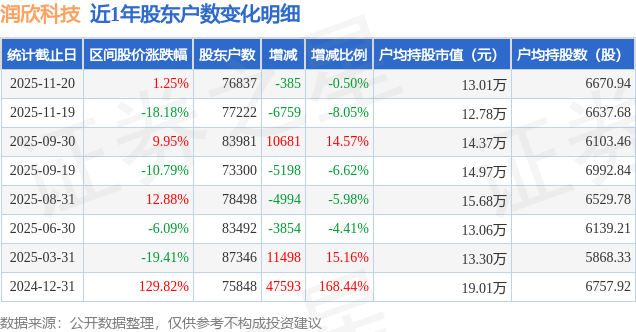 从股价来看,2025年11月19日至2025年11月20日,润欣科技区间涨幅为1.25%,在此期间股东户数减少385.0户,减幅为0.5%。