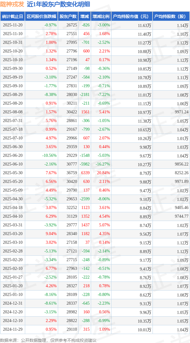从股价来看,2025年11月10日至2025年11月20日,陇神戎发区间跌幅为0.97%,在此期间股东户数减少826.0户,减幅为3.0%。