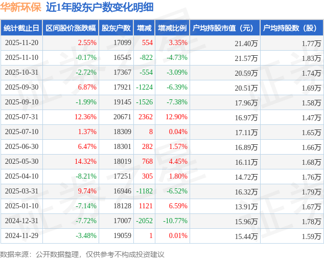 从股价来看,2025年11月10日至2025年11月20日,华新环保区间涨幅为2.55%,在此期间股东户数增加554.0户,增幅为3.35%。