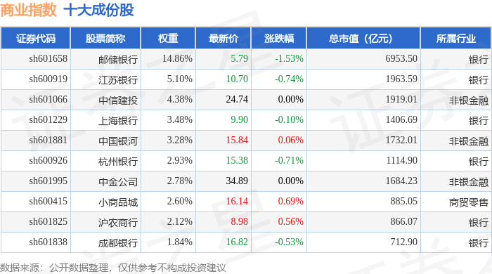 证券之星消息,11月26日,商业指数(000005)报收于2853.23点,跌0.3%,成交395.8亿元,换手率0.94%。当日该指数成份股中,上涨的有67家,海通发展以10.05%的涨幅领涨,下跌的有95家,慧辰股份以4.78%的跌幅领跌。