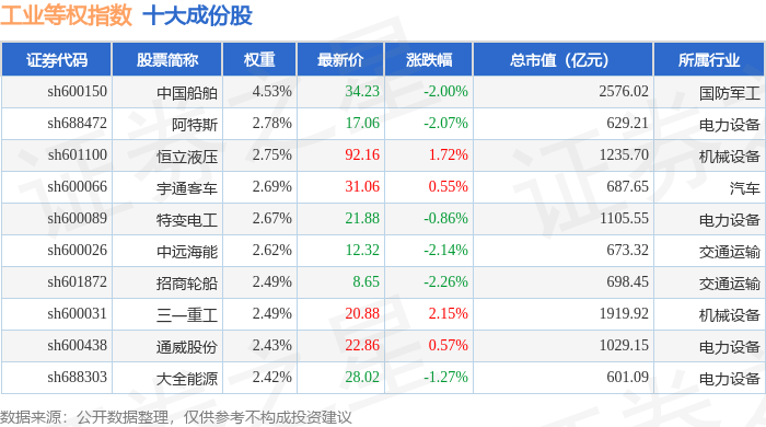证券之星消息,11月26日,工业等权(000072)指数报收于2942.82点,跌0.38%,成交336.43亿元,换手率0.54%。当日该指数成份股中,上涨的有16家,上海电气以3.14%的涨幅领涨,下跌的有30家,中航沈飞以3.26%的跌幅领跌。