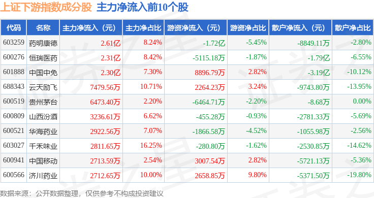 资金流向方面,上证下游(000096)指数成份股当日主力资金净流出合计14.05亿元,游资资金净流入合计5.61亿元,散户资金净流入合计8.44亿元。成份股资金流向详情见下表: