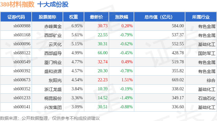 证券之星消息,11月26日,380材料(000105)指数报收于4917.84点,跌0.34%,成交169.61亿元,换手率1.37%。当日该指数成份股中,上涨的有14家,华峰铝业以6.73%的涨幅领涨,下跌的有34家,彤程新材以5.04%的跌幅领跌。
