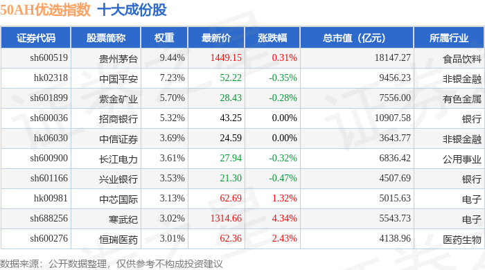 证券之星消息,11月26日,50AH优选(000170)指数报收于6129.04点,涨0.22%,成交715.98亿元,换手率0.3%。当日该指数成份股中,上涨的有24家,寒武纪以4.34%的涨幅领涨,下跌的有21家,中航沈飞以3.26%的跌幅领跌。