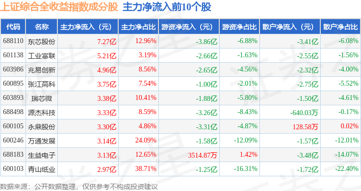 资金流向方面,上证综合全收益(000888)指数成份股当日主力资金净流出合计100.0亿元,游资资金净流入合计28.31亿元,散户资金净流入合计71.69亿元。成份股资金流向详情见下表: