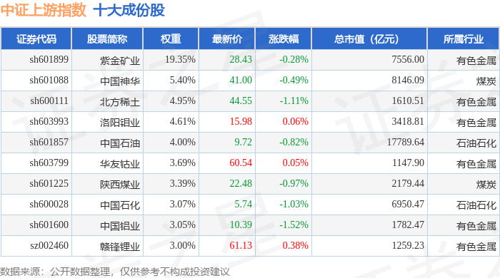 证券之星消息,11月26日,中证上游(000961)指数报收于4495.35点,跌0.31%,成交505.22亿元,换手率0.54%。当日该指数成份股中,上涨的有16家,中矿资源以3.82%的涨幅领涨,下跌的有34家,合盛硅业以3.19%的跌幅领跌。