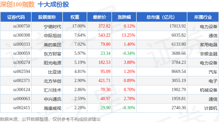 证券之星消息,11月26日,深创100(399088)指数报收于4819.9点,涨1.73%,成交1538.23亿元,换手率1.94%。当日该指数成份股中,上涨的有49家,中际旭创以13.25%的涨幅领涨,下跌的有50家,星源材质以3.4%的跌幅领跌。