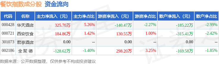 资金流向方面,餐饮指数(399238)成份股当日主力资金净流入合计381.93万元,游资资金净流入合计288.28万元,散户资金净流出合计670.21万元。成份股资金流向详情见下表: