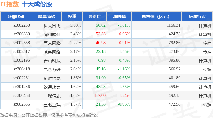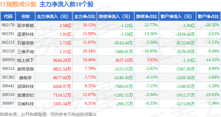 资金流向方面,IT指数(399239)成份股当日主力资金净流出合计66.43亿元,游资资金净流入合计2.34亿元,散户资金净流入合计64.09亿元。成份股资金流向详情见下表: