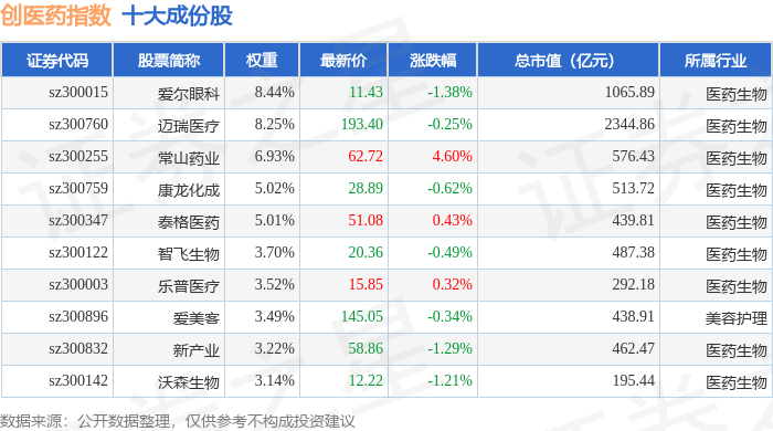 创医药(399275)指数十大成份股详情如下: