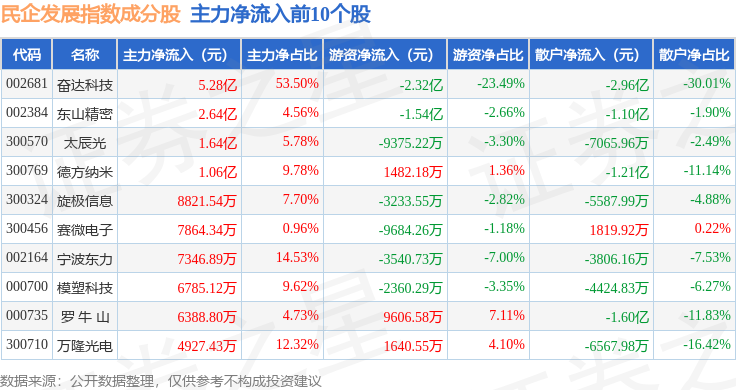 资金流向方面,民企发展(399292)指数成份股当日主力资金净流出合计22.01亿元,游资资金净流入合计7.17亿元,散户资金净流入合计14.84亿元。成份股资金流向详情见下表: