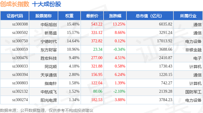 证券之星消息,11月26日,创成长(399296)指数报收于5721.01点,涨4.11%,成交1512.72亿元,换手率2.5%。当日该指数成份股中,上涨的有27家,中际旭创以13.25%的涨幅领涨,下跌的有23家,高伟达以3.46%的跌幅领跌。