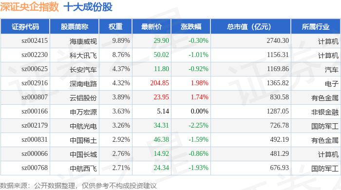 证券之星消息,11月26日,深证央企(399335)指数报收于4083.98点,跌0.46%,成交269.1亿元,换手率0.64%。当日该指数成份股中,上涨的有14家,电投产融以2.68%的涨幅领涨,下跌的有34家,中兵红箭以3.69%的跌幅领跌。