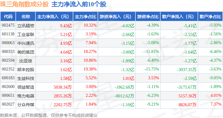 资金流向方面,珠三角(399356)指数成份股当日主力资金净流入合计14.94亿元,游资资金净流出合计9.5亿元,散户资金净流出合计5.44亿元。成份股资金流向详情见下表:
