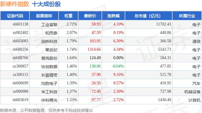 证券之星消息,11月26日,新硬件(399360)指数报收于7321.02点,涨1.02%,成交1168.12亿元,换手率2.08%。当日该指数成份股中,上涨的有58家,上海机电以10.0%的涨幅领涨,下跌的有40家,中无人机以3.59%的跌幅领跌。