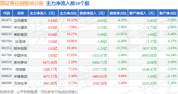资金流向方面,国证责任(399369)指数成份股当日主力资金净流入合计15.86亿元,游资资金净流出合计10.65亿元,散户资金净流出合计5.49亿元。成份股资金流向详情见下表: