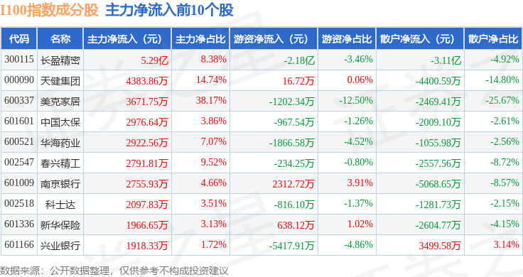 资金流向方面,I100(399415)指数成份股当日主力资金净流出合计24.48亿元,游资资金净流入合计10.39亿元,散户资金净流入合计14.1亿元。成份股资金流向详情见下表: