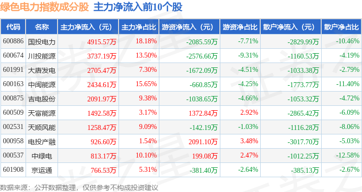 资金流向方面,绿色电力(399438)指数成份股当日主力资金净流出合计2.76亿元,游资资金净流入合计1.05亿元,散户资金净流入合计1.71亿元。成份股资金流向详情见下表: