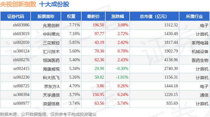 央视创新(399551)指数十大成份股详情如下:
