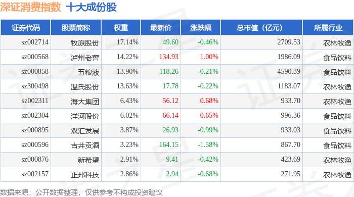 深证消费(399617)指数十大成份股详情如下: