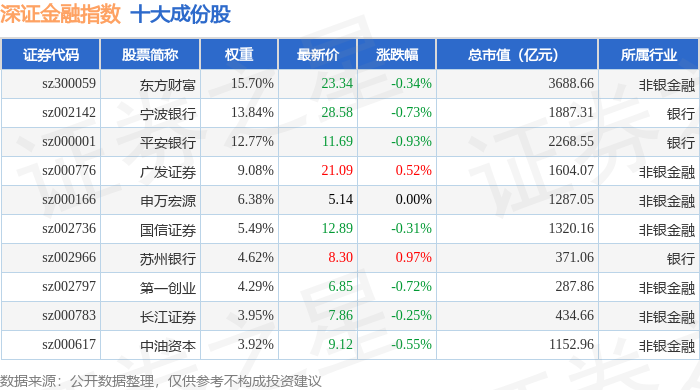 资金流向方面,深证金融(399619)指数成份股当日主力资金净流出合计6.1亿元,游资资金净流入合计7504.47万元,散户资金净流入合计5.35亿元。成份股资金流向详情见下表: