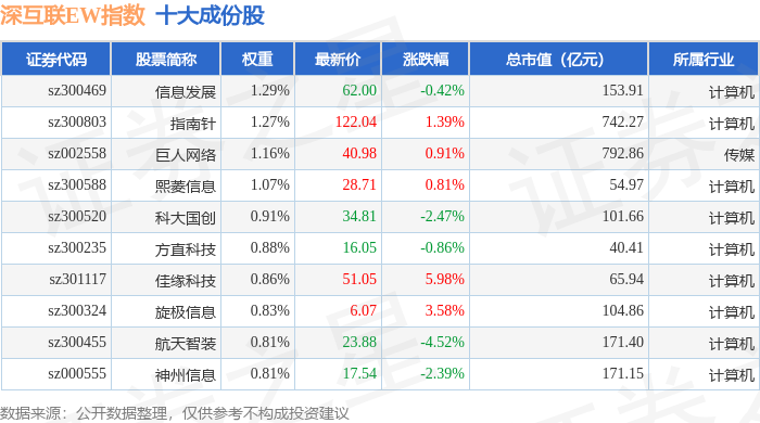证券之星消息,11月26日,深互联EW(399677)指数报收于5736.9点,跌0.94%,成交790.27亿元,换手率4.14%。当日该指数成份股中,上涨的有29家,三维天地以20.01%的涨幅领涨,下跌的有136家,富春股份以11.11%的跌幅领跌。