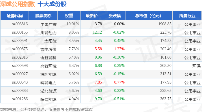 证券之星消息,11月26日,深成公用(399689)指数报收于840.15点,跌0.09%,成交24.35亿元,换手率0.43%。当日该指数成份股中,上涨的有4家,吉电股份以1.27%的涨幅领涨,下跌的有9家,川能动力以0.82%的跌幅领跌。