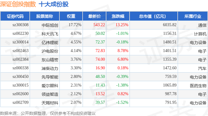证券之星消息,11月26日,深证创投(399696)指数报收于4084.83点,涨2.98%,成交1351.25亿元,换手率3.97%。当日该指数成份股中,上涨的有49家,中际旭创以13.25%的涨幅领涨,下跌的有116家,富春股份以11.11%的跌幅领跌。