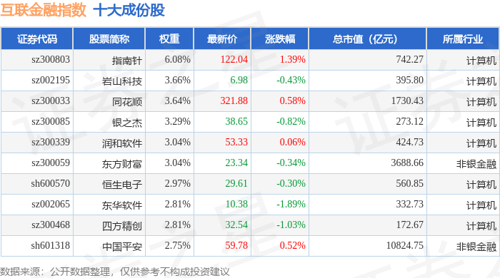 资金流向方面,互联金融(399805)指数成份股当日主力资金净流出合计15.89亿元,游资资金净流入合计3.66亿元,散户资金净流入合计12.2亿元。成份股资金流向详情见下表: